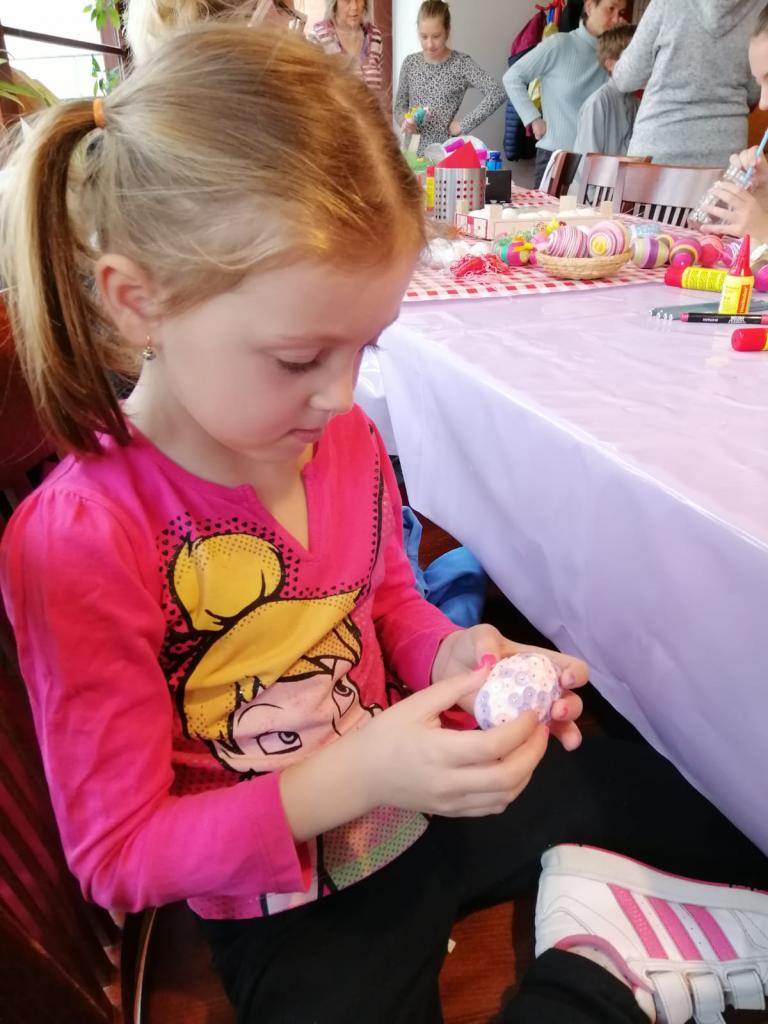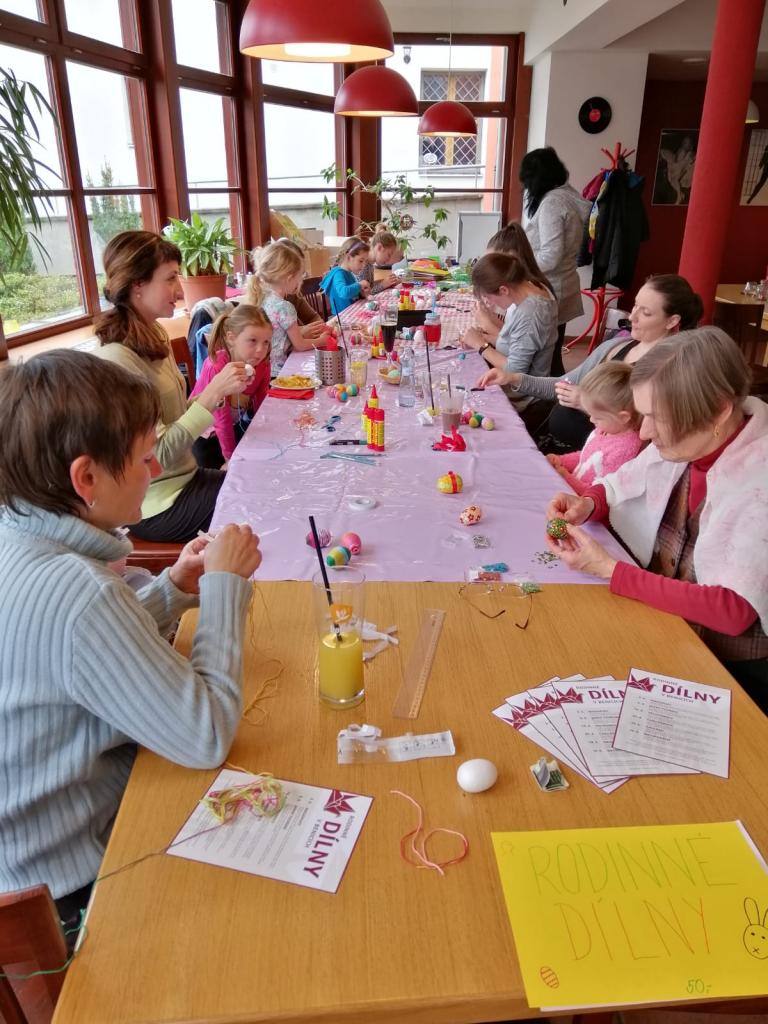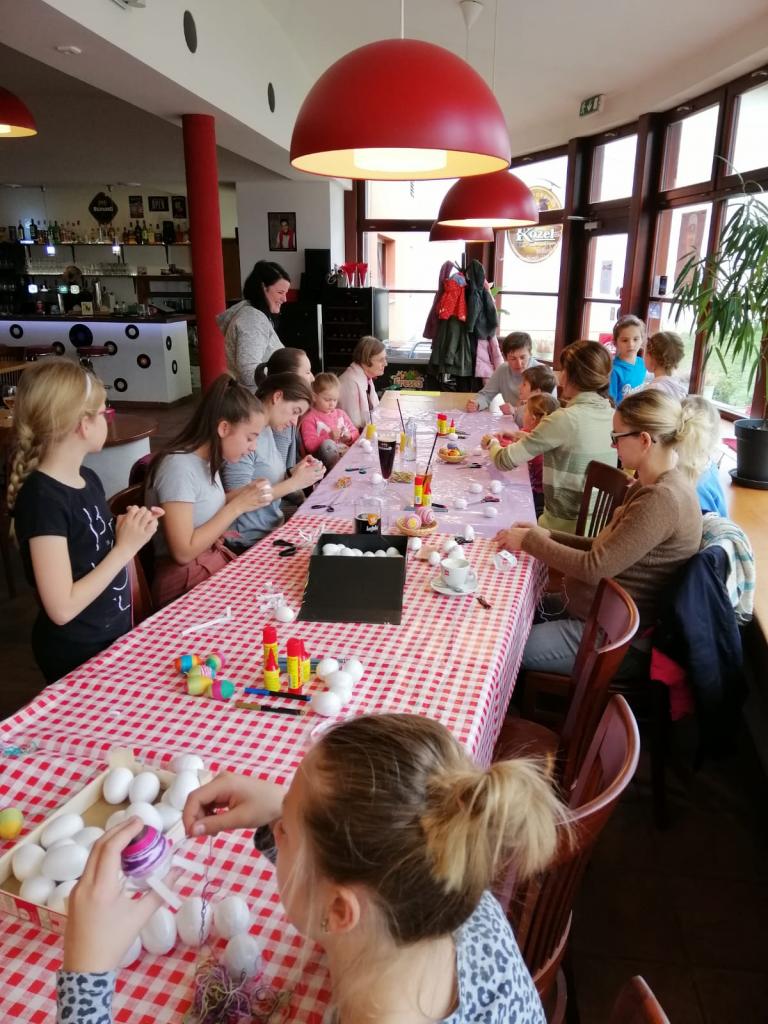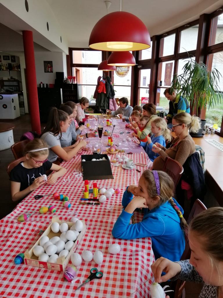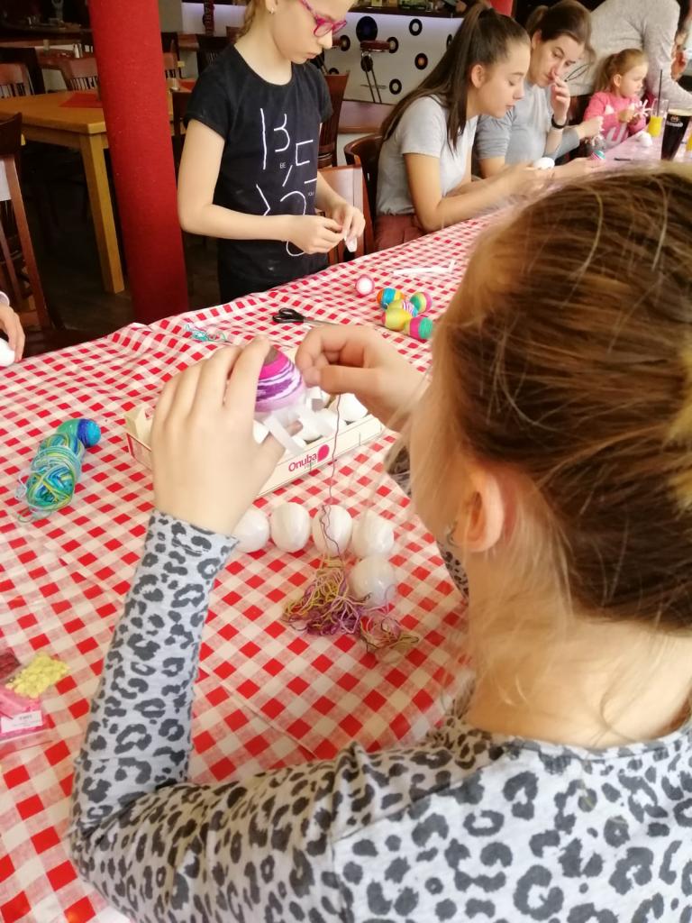 Naši stálí a tentokrát již nedočkaví tvořitelé se začali scházet už půl hodiny před samotným začátkem, aby si pečlivě prohlédli, co se bude vyrábět a čím si případně své výtvory vyzdobí. Zkušená tvořitelka Domča si pro nás připravila netradiční zdobení polystyrenových vajec pomocí bavlnek či flitrů, byly však k dispozici také klasické temperové a vodové barvy. Ozdobená vejce si pak mohli tvořílci napíchnout na špejle, či zavěsit na vlasec, většina se však rozhodla z nich vytvořit velikonoční věnec na dveře, který pak již stačilo jen ozdobit dekorační trávou, včeličkami, kuřátky a dalšími velikonočními motivy, kterých bylo nepřeberné množství. Beničtí tak strávili další příjemné odpoledne kreativním tvořením a už teď se můžeme těšit na další rodinné dílny, kde se budou vyrábět čarodějnice na blížící se Filipojakubskou noc.