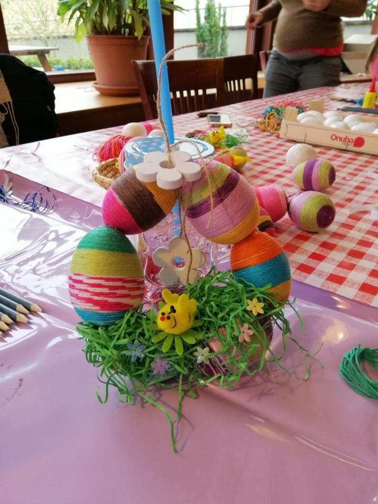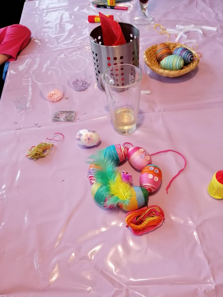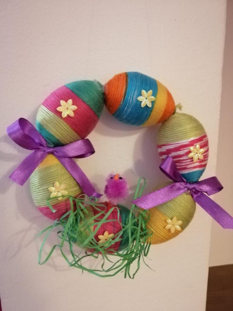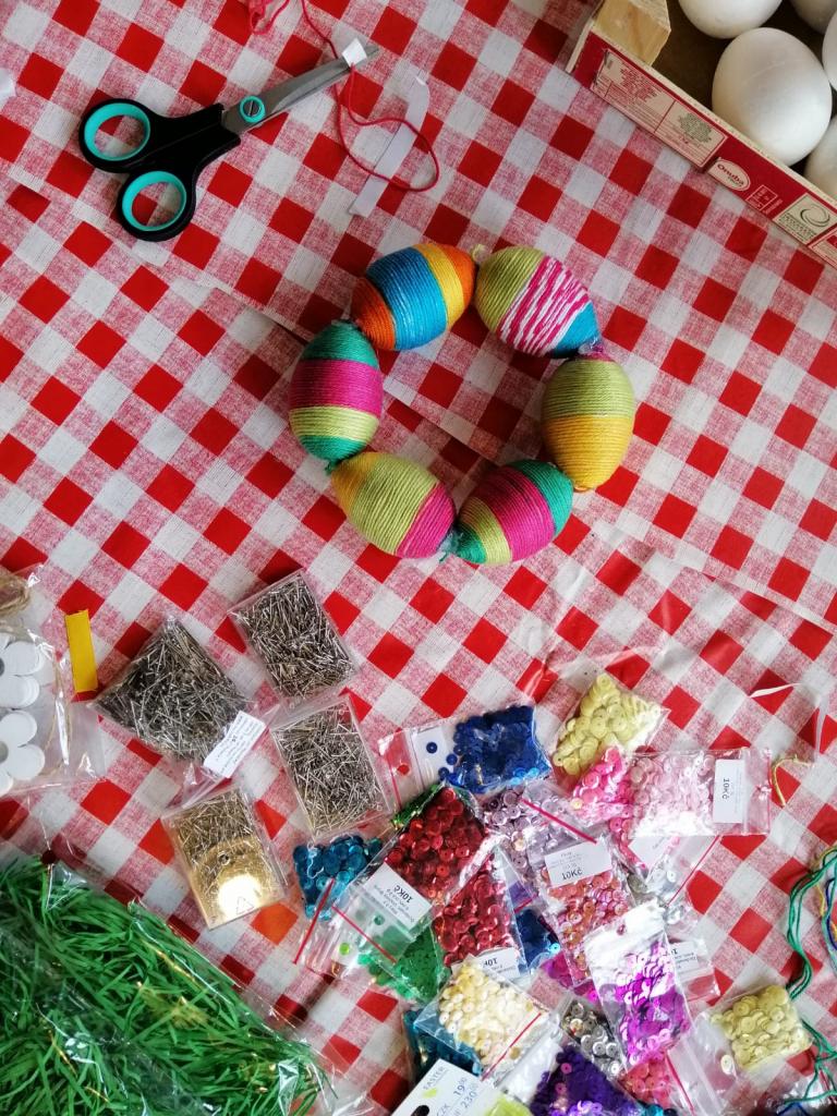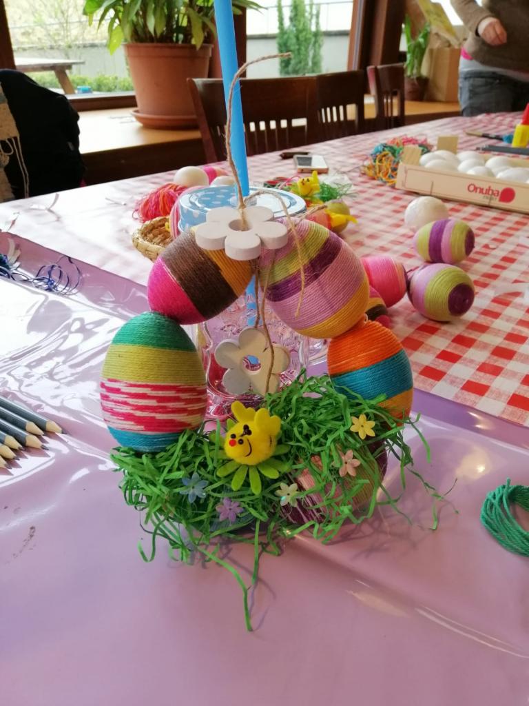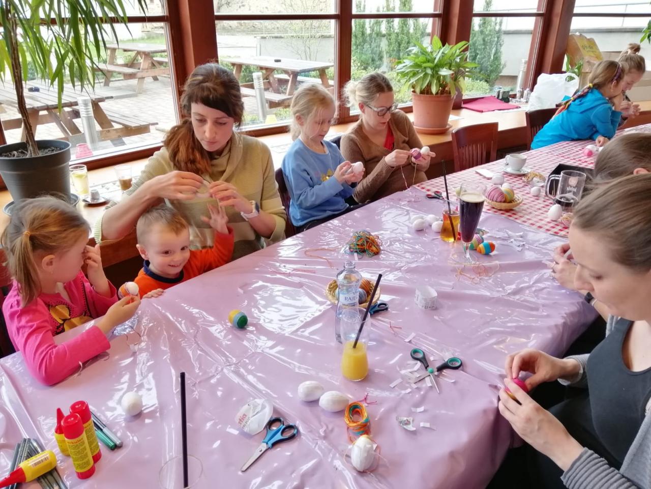 Naši stálí a tentokrát již nedočkaví tvořitelé se začali scházet už půl hodiny před samotným začátkem, aby si pečlivě prohlédli, co se bude vyrábět a čím si případně své výtvory vyzdobí. Zkušená tvořitelka Domča si pro nás připravila netradiční zdobení polystyrenových vajec pomocí bavlnek či flitrů, byly však k dispozici také klasické temperové a vodové barvy. Ozdobená vejce si pak mohli tvořílci napíchnout na špejle, či zavěsit na vlasec, většina se však rozhodla z nich vytvořit velikonoční věnec na dveře, který pak již stačilo jen ozdobit dekorační trávou, včeličkami, kuřátky a dalšími velikonočními motivy, kterých bylo nepřeberné množství. Beničtí tak strávili další příjemné odpoledne kreativním tvořením a už teď se můžeme těšit na další rodinné dílny, kde se budou vyrábět čarodějnice na blížící se Filipojakubskou noc.